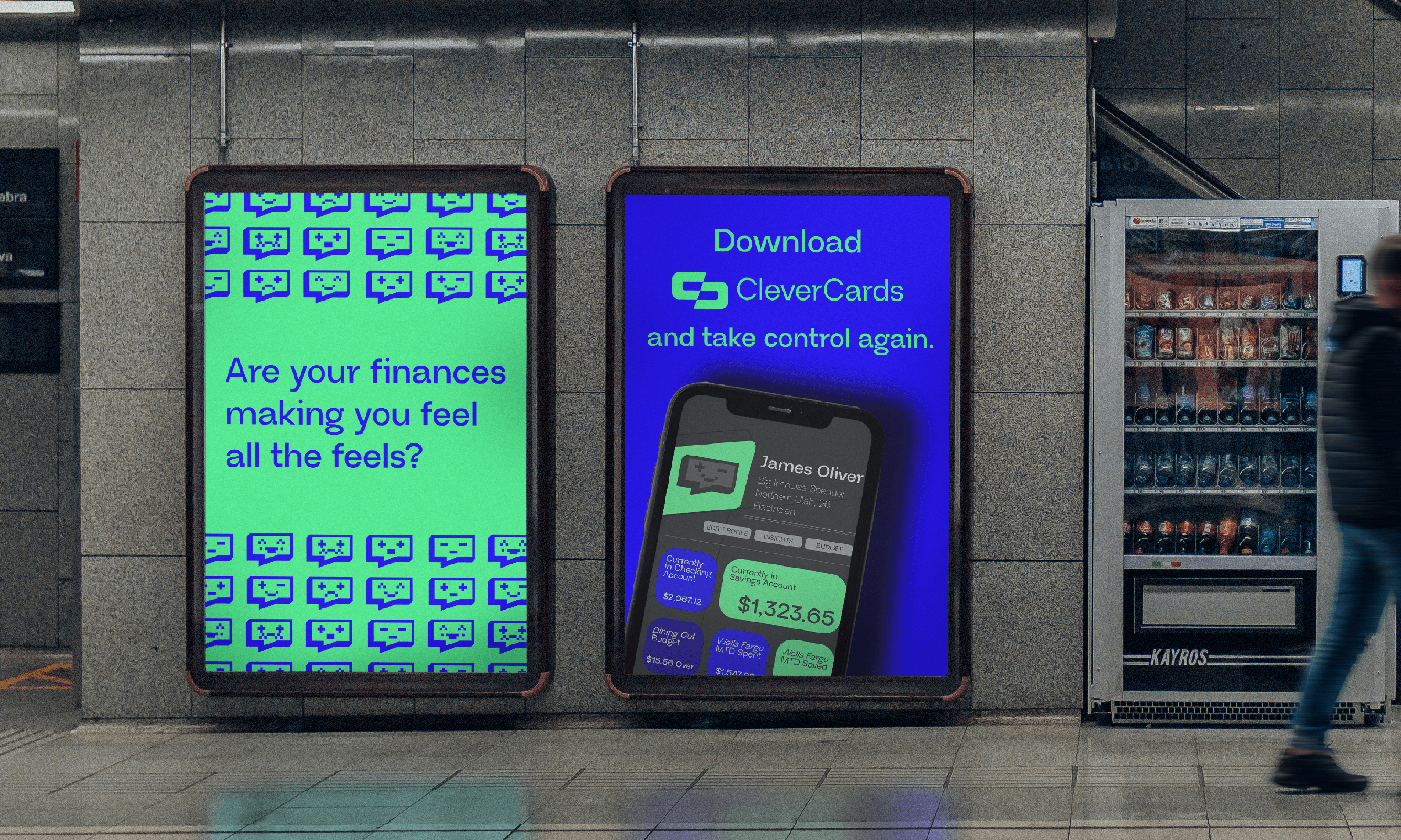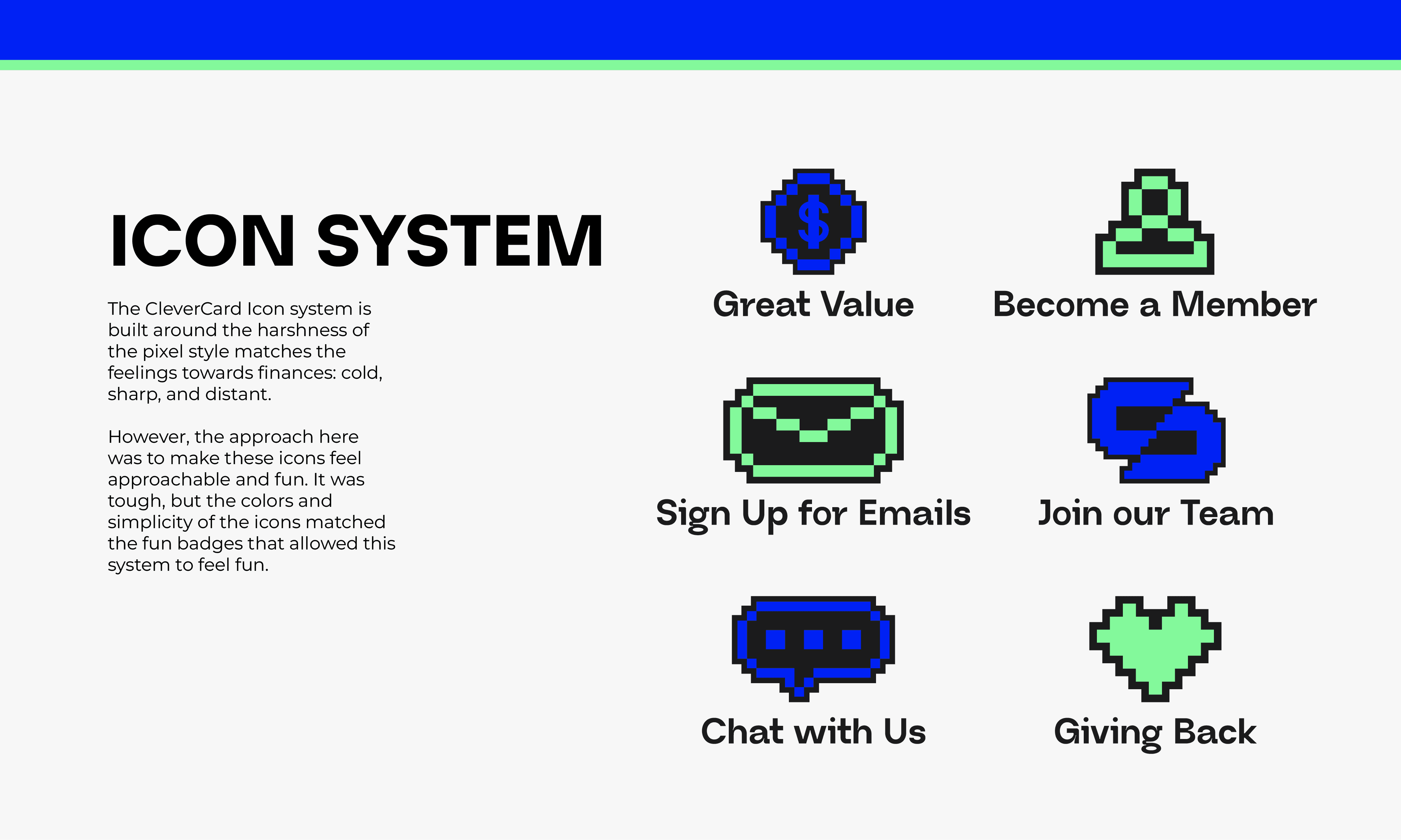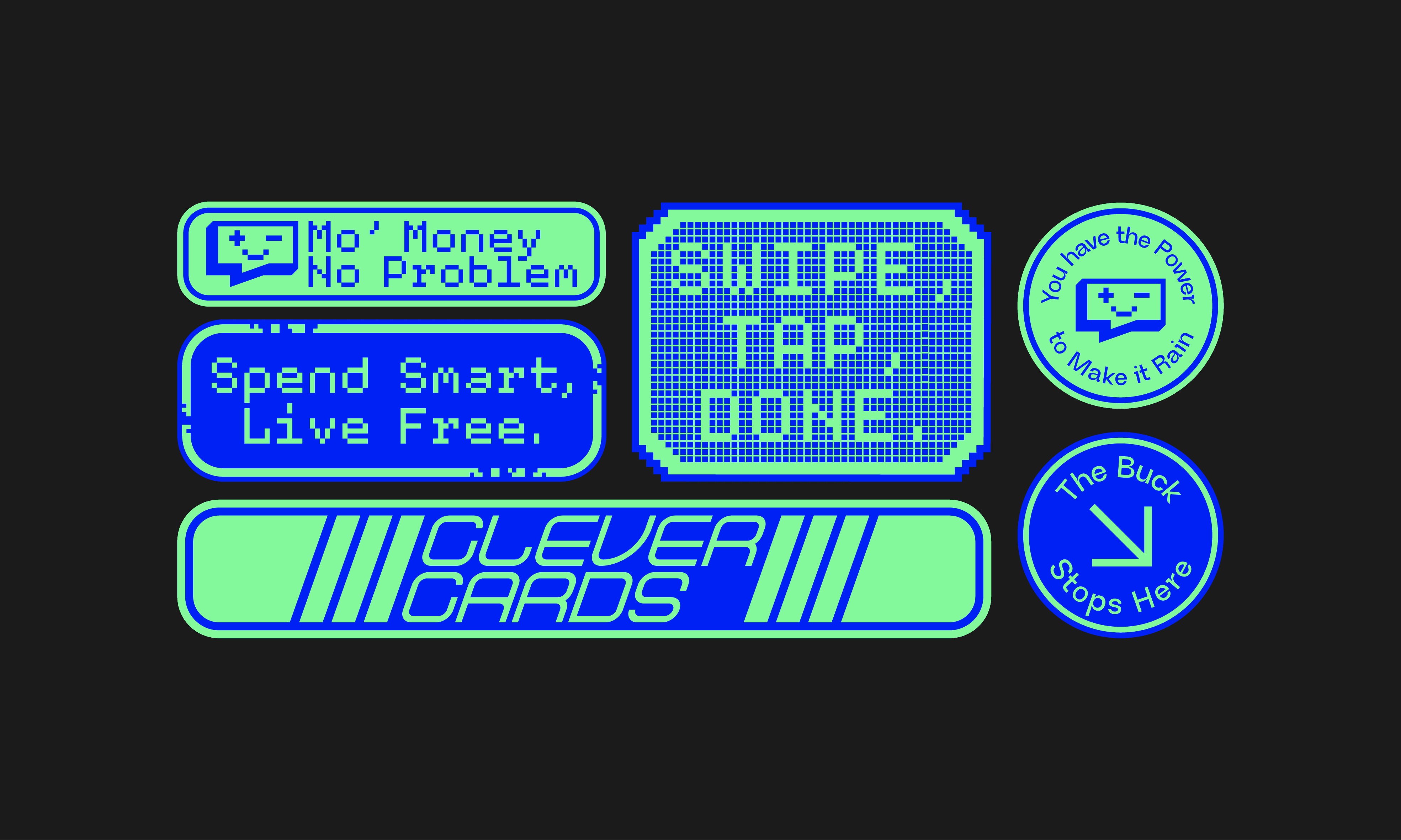 Bright green and blue set an optimistic tone from the start. The brand feels open, friendly, and encouraging. Clever Cards meets users where they are and helps them build confidence one decision at a time.
