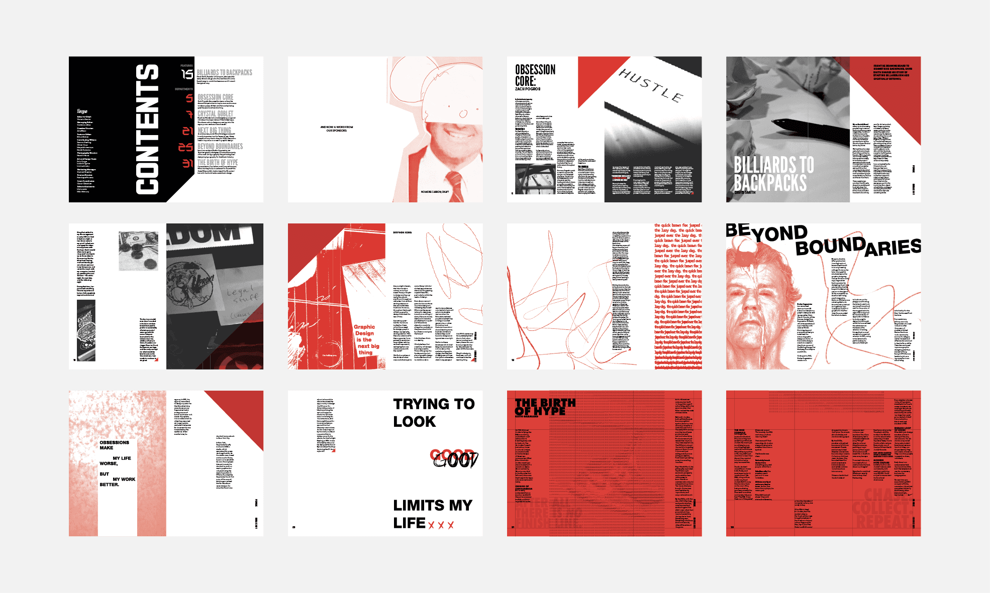 As laid out in the exerpt above, the layout and visual language features a strong grid that ocasionally has a diagonal line. While these layouts may appear to break the grid, it all sits correctly on the underlying grid.