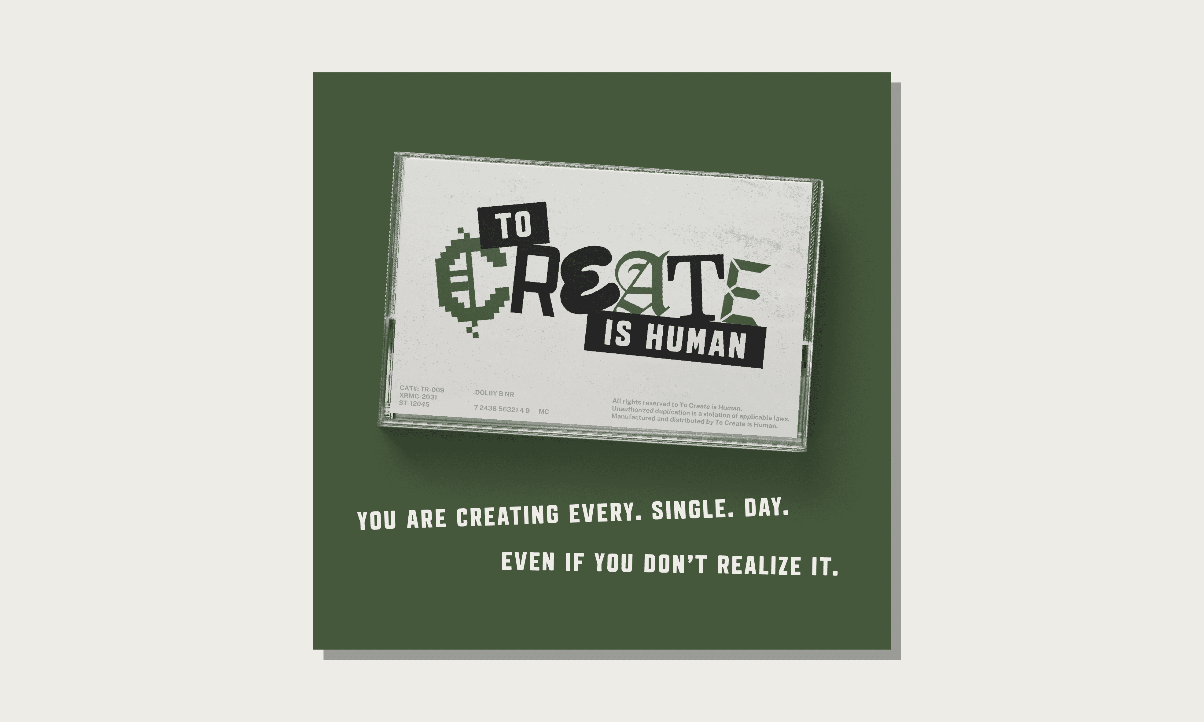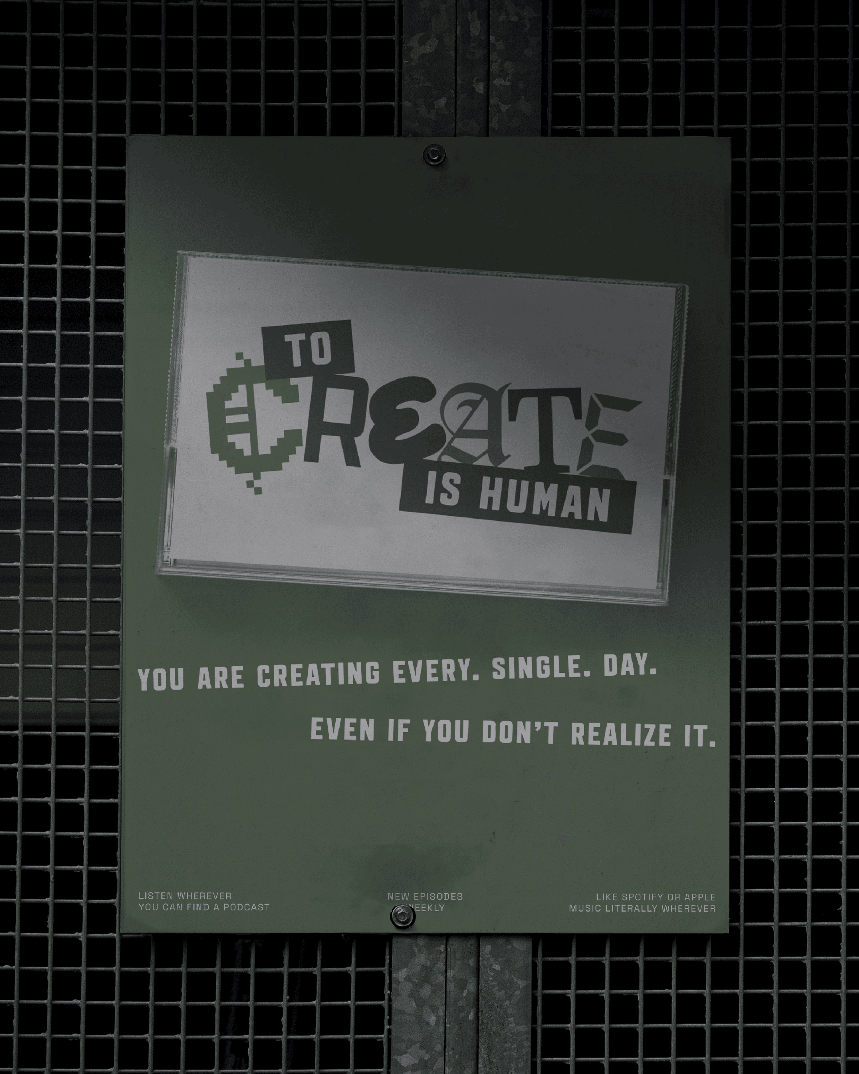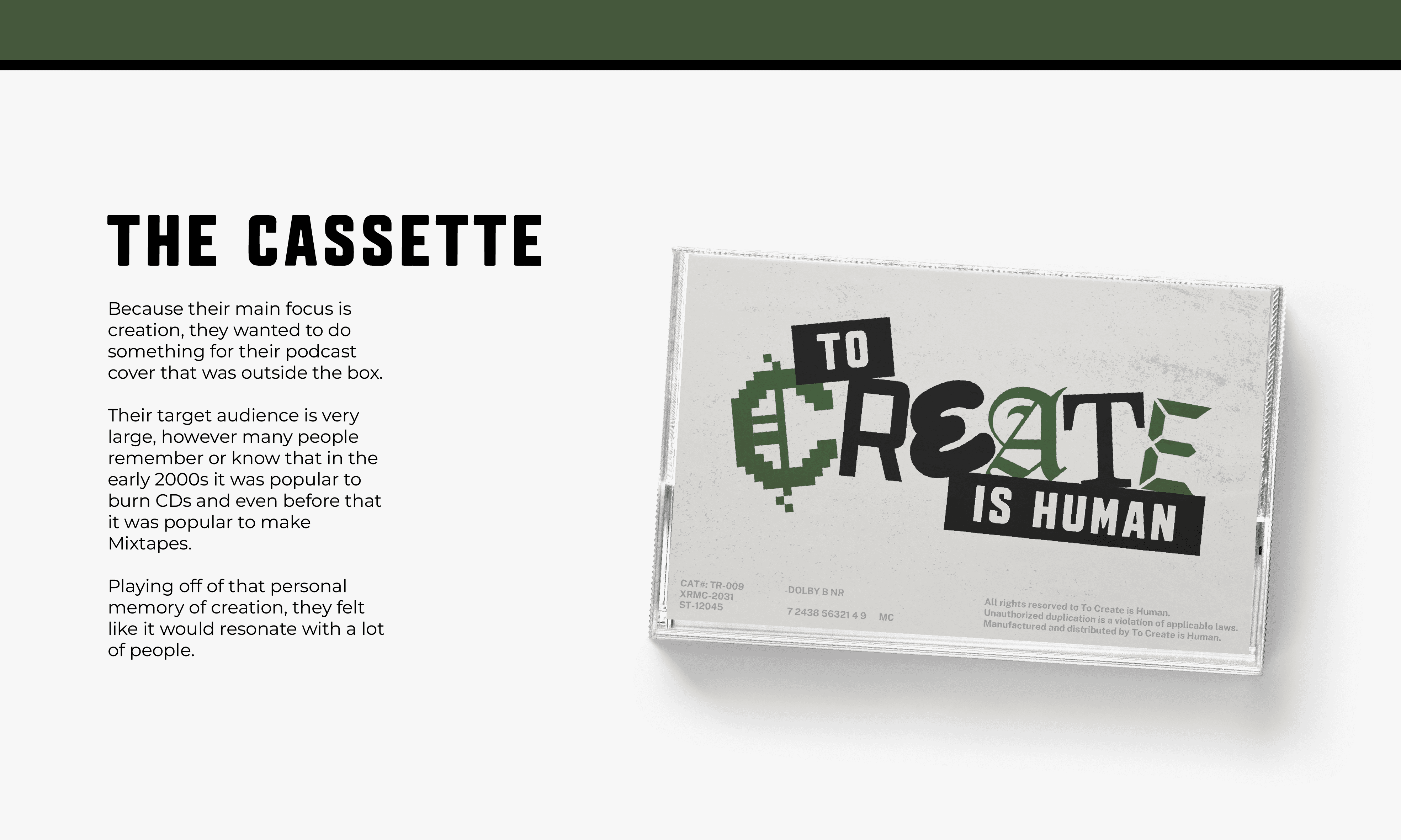 This "Create" mark has 6 different typefaces that each resemble a different part of creativity. This mark paired with the Cassette Tape Cover placed on the podcast cover only reenforced the idea of creation as we sought to target the majority of the audiences early interaction with creativity. Whether it was Tapes, CDs, or even the curation of Playlists, we wanted to show the audience that they were creative.